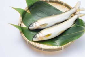 ■鮎の旬と「走り」「盛り」「名残」■ 鮎の旬は一般的に初夏から秋にかけてとわれていますが、その味わいは時期によって繊細に変化します。6月頃の、まだ小ぶりで骨も柔らかい鮎は「走り」とも呼ばれ、内臓の苦みが少なく、身の淡白な旨味と独特の香りが際立ちます。 7月から8月の盛期には、卵や白子を持ち始める「盛り」の鮎となり、身はふっくらと脂が乗り、内臓のほろ苦さが加わることで、より複雑な風味を醸し出します。そして、9月以降の産卵期を控えた鮎は「名残」と呼ばれ、特に子持ち鮎の味わいは多くの食通を魅了します。このように、鮎は時期ごとの個性的な旬を楽しめる魚なのです。 また、鮎は、清らかな川底に生える草を食べて育つため、身に独特の芳香成分が蓄積され「香魚」ともよばれています。水質の良い、良質なコケが豊富に生える川で育った鮎ほど香りが強く、「食べると苔の味がする」と表現されることもあります。 ■鮎の塩焼きの美味しい食べ方■ 鮎といえば、なんといっても塩焼き。 基本の食べ方は、頭から尻尾まで丸ごと! 鮎の塩焼きは、その香りと内臓のほろ苦さが醍醐味です。新鮮で小ぶりな鮎、特に若鮎なら、頭から尻尾、骨まで丸ごと食べられます。 頭: 香ばしく焼けた頭は、パリッとした食感と凝縮された旨味が楽しめます。躊躇せずそのままいただきましょう。 身: 皮目の香ばしさと、ふっくらとした身のコントラストを楽しみます。箸で身を軽くほぐし、ワタ(内臓)と一緒に食べると、鮎ならではの奥深い味わいが広がります。 ワタ(内臓): 鮎の真骨頂ともいえるのが、このワタのほろ苦さです。好き嫌いは分かれるかもしれませんが、ぜひ一度はチャレンジしてみてください。この苦味が、身の甘みを一層引き立てるアクセントになります。 鮎の塩焼きには、たで酢(蓼酢)がよく合います。たで酢はたで科の柳蓼の葉をすり潰して酢でのばした調味料で、鮎の脂や苦味を引き締め、より一層風味豊かにしてくれます。添えられていたら、ぜひ試してみてください。 ■鮎の和菓子、「あゆ菓子」を知っていますか?■ 鮎の形をした和菓子・あゆ菓子を知っていますか? 「あゆ菓子」は、夏の風物詩である鮎をかたどった可愛らしい和菓子で、地域によって「若鮎」「稚鮎」「鮎焼き」などさまざまな呼び名があります。特に岐阜県や京都府の銘菓として知られています。 その名の通り、鮎の姿を模した形状で、焼きごてで付けられた鮎の目や口、尾ひれの焼き印が施されている和菓子もあります。生地は、薄く焼かれたカステラ生地やどら焼き生地が使われることが多いようです。しっとりとしたものからややカリッとした食感のものまで、お店によって様々です。お好みの「あゆ菓子」を見つけましょう。 塩焼きから和菓子まで。今の時期だからこそ味わえる鮎の風味を満喫しましょう!